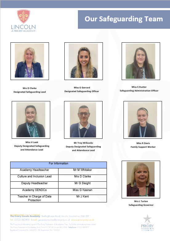 The pastoral care, safety and wellbeing of our students is of paramount importance. We understand that children will achieve their very best when they are in a place where they feel seen, safe and cared for. We have an extensive Pastoral Team that includes Heads of Year, Pastoral Managers, The Safeguarding Team and our Form Tutors. Please see below the Safeguarding and Pastoral Teams. If you would like to contact any of the staff at Priory Lincoln, please do so by ringing the Academy on 01522 882 800 or email generalenquiries@priorycity.co.uk.