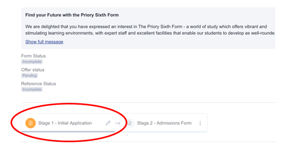 If you are not currently studying at Priory Lincoln Academy, you can apply using the link provided here. The application process is quick and easy. You will need the phone number and email address of a parent or carer, so please ensure you have these details ready before you begin. Once you have created an account, click on 'Stage 1 – Initial Application' as shown in the image below, then complete the questions that appear. This should take no more than five minutes.