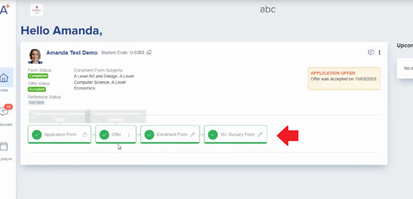 Log into your existing Admissions+ account and select the 16+ Bursary Form tile, see the screenshot below: